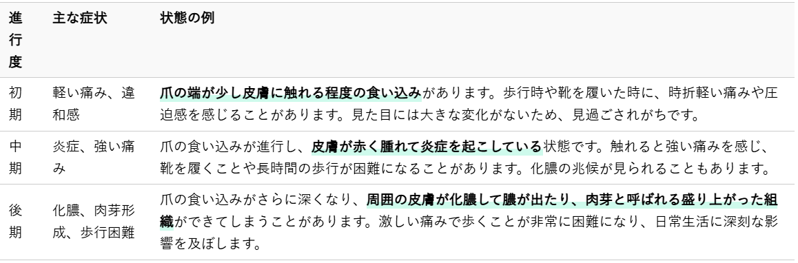 巻き爪の症状は、その進行度合いによって変化します。ご自身の爪の状態がどの段階にあるのかを知ることは、適切な対処を始める上で非常に重要です。