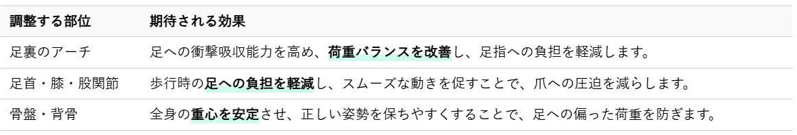 評価に基づき、足だけでなく、足首、ふくらはぎ、膝、股関節、骨盤、背骨といった全身の関節や筋肉に対して手技によるアプローチを行います。特に、足裏のバランスを整えたり、足指が正しく使えるように促したりすることで、足にかかる不自然な負担を軽減し、爪への圧力を分散させることを目指します。これにより、爪が正常な成長をしやすい環境を整えていきます。