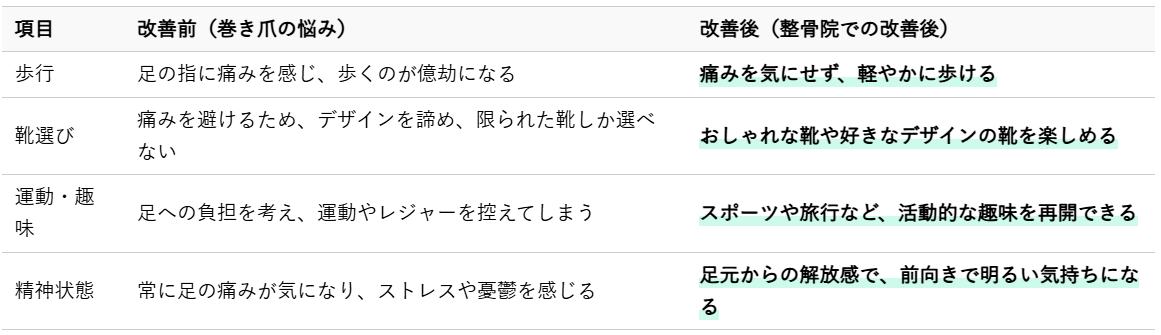 巻き爪の痛みに悩む日々は、足元だけでなく心にも重くのしかかるものです。しかし、整骨院での適切な改善プログラムによって、その痛みから解放されると、あなたの日常は大きく変わります。