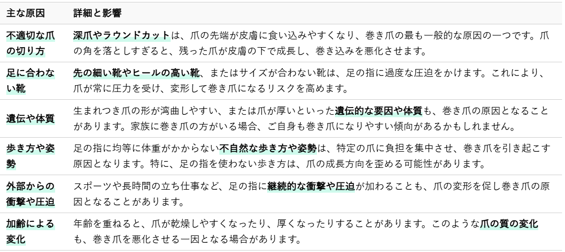 巻き爪は、足の指の爪が内側に強く湾曲し、周囲の皮膚に食い込む状態を指します。その原因は一つではなく、いくつかの要因が複雑に絡み合って発生することがほとんどです。ここでは、巻き爪を引き起こす主な原因について詳しくご説明します。