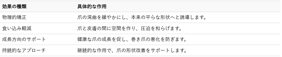 この持続的な牽引力は、爪が成長する方向にも良い影響を与え、健康的な爪の形成をサポートします。結果として、巻き爪の悪化を防ぎ、再発しにくい状態へと導くための土台作りにもつながるのです。
