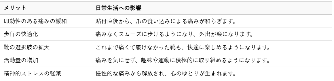 巻き爪による痛みは、日常生活に大きな支障をきたすことがあります。歩くたびにズキズキとした痛みを感じたり、お気に入りの靴を履くことを諦めたりと、活動範囲が制限されてしまうことも少なくありません。巻き爪テーピングは、このような痛みの緩和に即効性があり、貼付直後から快適さを実感できる場合があります。