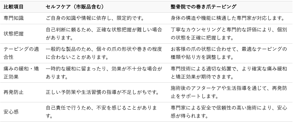 巻き爪のケア方法には、ご自宅でのセルフケアや市販の矯正グッズの使用など、様々な選択肢があります。しかし、これらは一時的な対処に留まったり、正しい知識がないと効果が得られにくい場合があります。整骨院での巻き爪テーピングは、これらの方法と比較して、いくつかの明確な優位性を持っています。