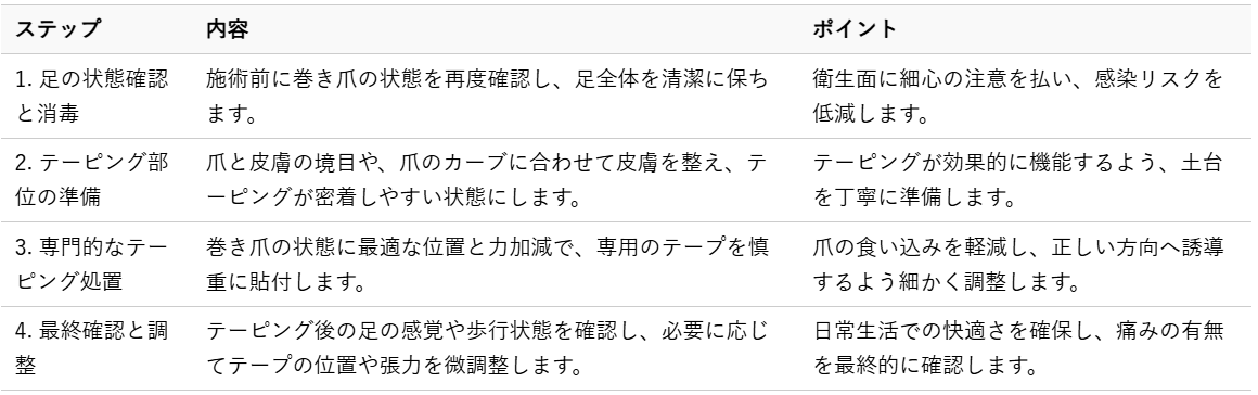 このように、一つ一つのステップを丁寧に進めることで、巻き爪の症状改善と再発防止を目指します。