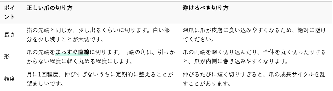 正しい爪の切り方は、「スクエアオフ」と呼ばれる形です。爪の角を切り落とさず、まっすぐに整えることで、爪が皮膚に食い込むのを防ぎます。