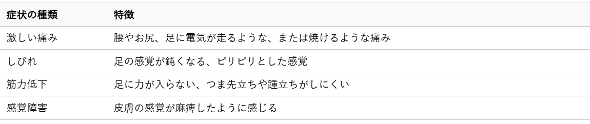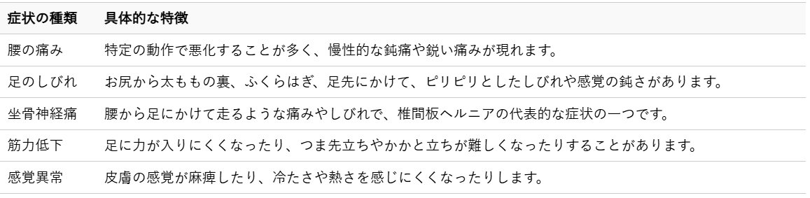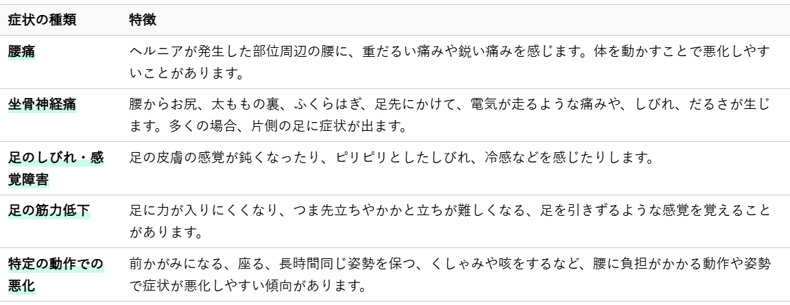 椎間板ヘルニアの主な症状は、次の表のようにまとめられます。