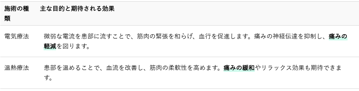 手技療法と並行して、電気療法や温熱療法も効果的に用いられます。これらの物理療法は、痛みの緩和や筋肉の緊張を和らげることを目的としています。