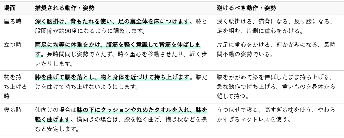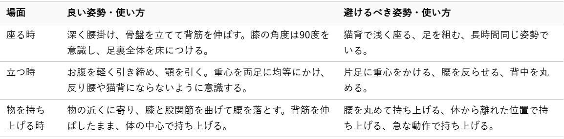 ヘルニアの痛みを繰り返さないためには、日常生活における体の使い方を見直すことが非常に重要です。無意識に行っている動作が、椎間板に大きな負担をかけていることも少なくありません。