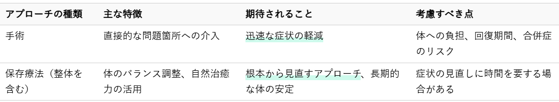 もちろん、緊急性の高いケースや重度の神経症状がある場合には手術が検討されることもありますが、そうでない限り、体への負担が少ないアプローチから試してみることは非常に大切な選択です。ご自身の体の状態やライフスタイルに合わせて、最適な方法を見つけることが、快適な生活を取り戻すための第一歩となります。