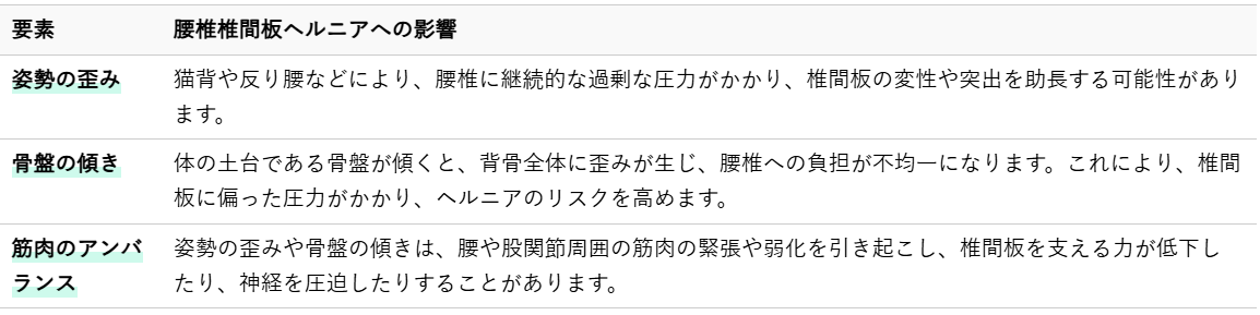 椎間板ヘルニアは、背骨の間にあるクッション材である椎間板が飛び出し、神経を圧迫することで痛みやしびれを引き起こします。この椎間板への過度な負担は、多くの場合、日頃の姿勢や骨盤の歪みに起因していると考えられます。