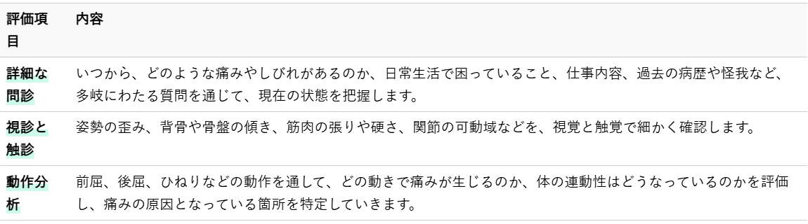 これらの評価を通じて、お客様の腰椎椎間板ヘルニアがなぜ発生しているのか、痛みの根本的な原因はどこにあるのかを突き止め、最適な施術計画を立てていきます。不明な点があれば、納得がいくまでご説明いたしますので、ご安心ください。