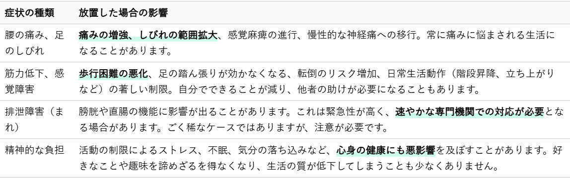これらの症状は、飛び出した髄核がどの神経を圧迫しているかによって、現れる部位や程度が異なります。特に、安静にしていても痛みが続く場合や、排尿・排便に問題が生じる場合は、速やかに専門家へ相談することが大切です。