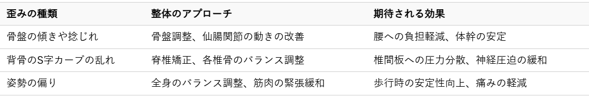 整体では、これらの姿勢の歪みや骨盤の傾きを丁寧に評価し、手技によって本来あるべき位置へと調整していきます。骨盤が正しい位置に戻ることで、背骨全体のアライメントが整い、腰椎への負担が軽減されます。これにより、椎間板への不必要な圧力が取り除かれ、神経圧迫の緩和が期待できるのです。