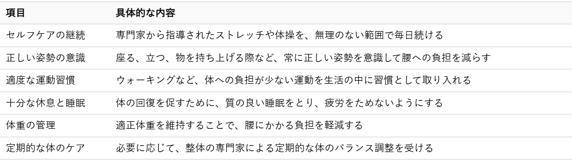 整体で体の歪みが整った後も、適度な運動とストレッチは、腰周りの筋肉の柔軟性を保ち、体幹を強化するために欠かせません。これにより、腰椎への負担を分散させ、ヘルニアの再発リスクを減らすことにつながります。