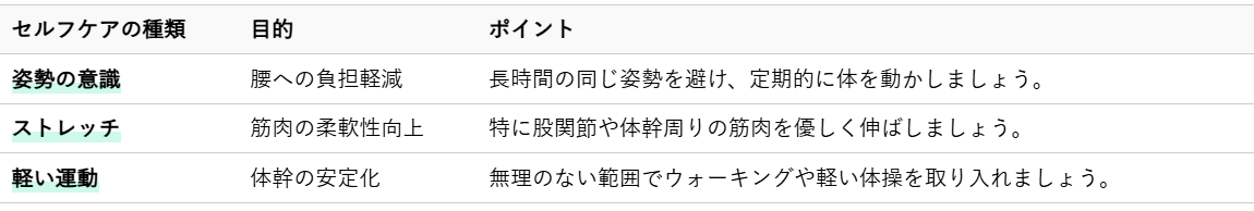 ストレスは体の緊張を高め、痛みを増幅させることがあります。リラックスできる時間を作り、ストレスを上手に解消する工夫も大切です。また、体が冷えると血行が悪くなり、筋肉が硬くなりがちです。特に腰周りを冷やさないよう、温かい服装や入浴などで体を温めることを心がけましょう。