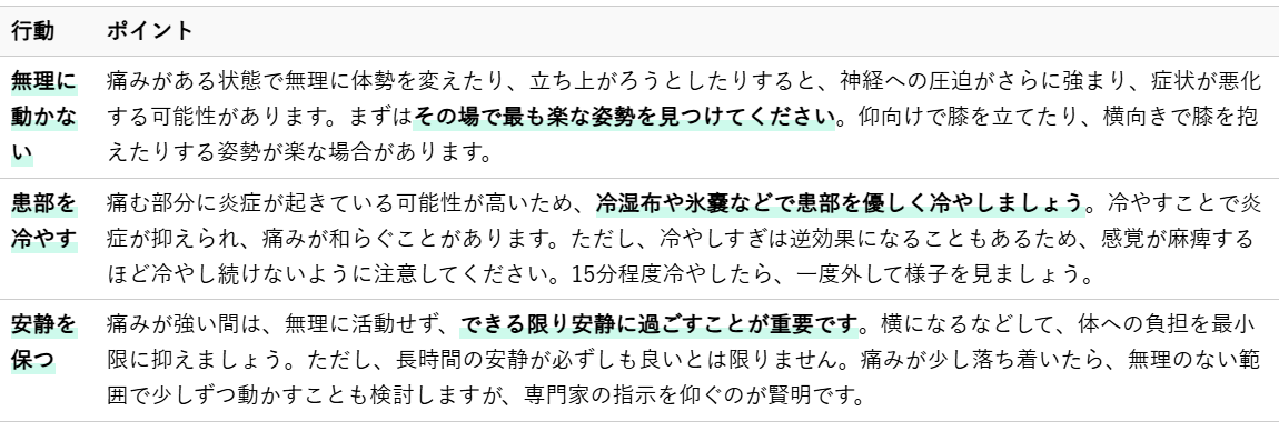 動けないほどの痛みがある場合、まずは無理をせず、ご自身の身体を第一に考えてください。緊急時の対処として、以下の方法を試してみましょう。