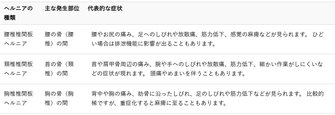ヘルニアにはいくつかの種類があり、それぞれ発生部位や症状が異なります。