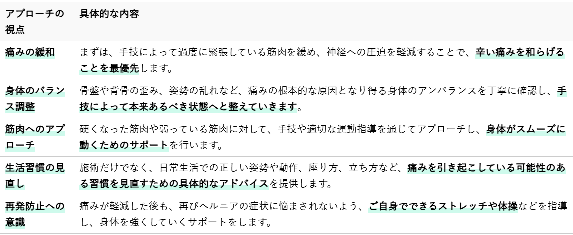 これらのアプローチを通じて、整骨院はヘルニアで動けない辛さから解放され、再び快適な日常生活を送れるよう、全力でサポートいたします。