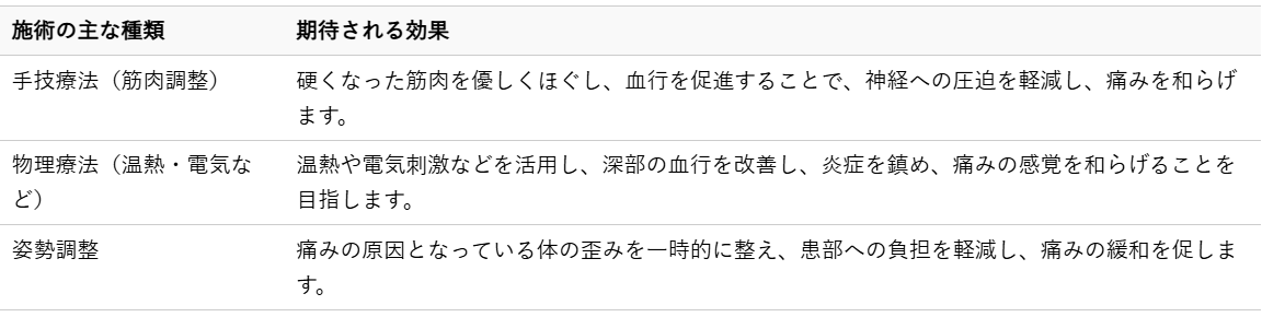 具体的には、硬くなった筋肉の緊張を緩める手技療法や、血行を促進して炎症の回復を助ける物理療法などが用いられます。これらのアプローチは、神経への圧迫を軽減し、体が本来持つ回復力を高めることを目的とします。痛みが強い時期は、体に負担をかけすぎないよう、慎重かつ段階的に施術を進めていきます。また、一時的に体のバランスを整えることで、痛みの緩和を促します。