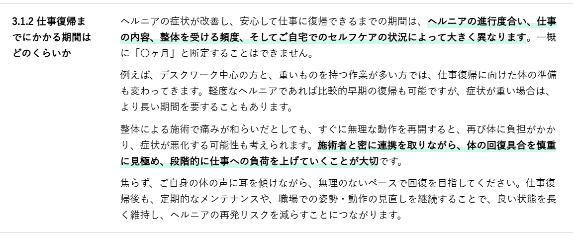 ヘルニアの痛みが和らいだとしても、再び仕事で無理をしてしまえば、痛みが再発するのではないかと不安に感じるかもしれません。ここでは、整体がどのようにヘルニアの痛みと向き合い、さらに仕事復帰後も良い状態を維持していくための秘訣をご紹介します。